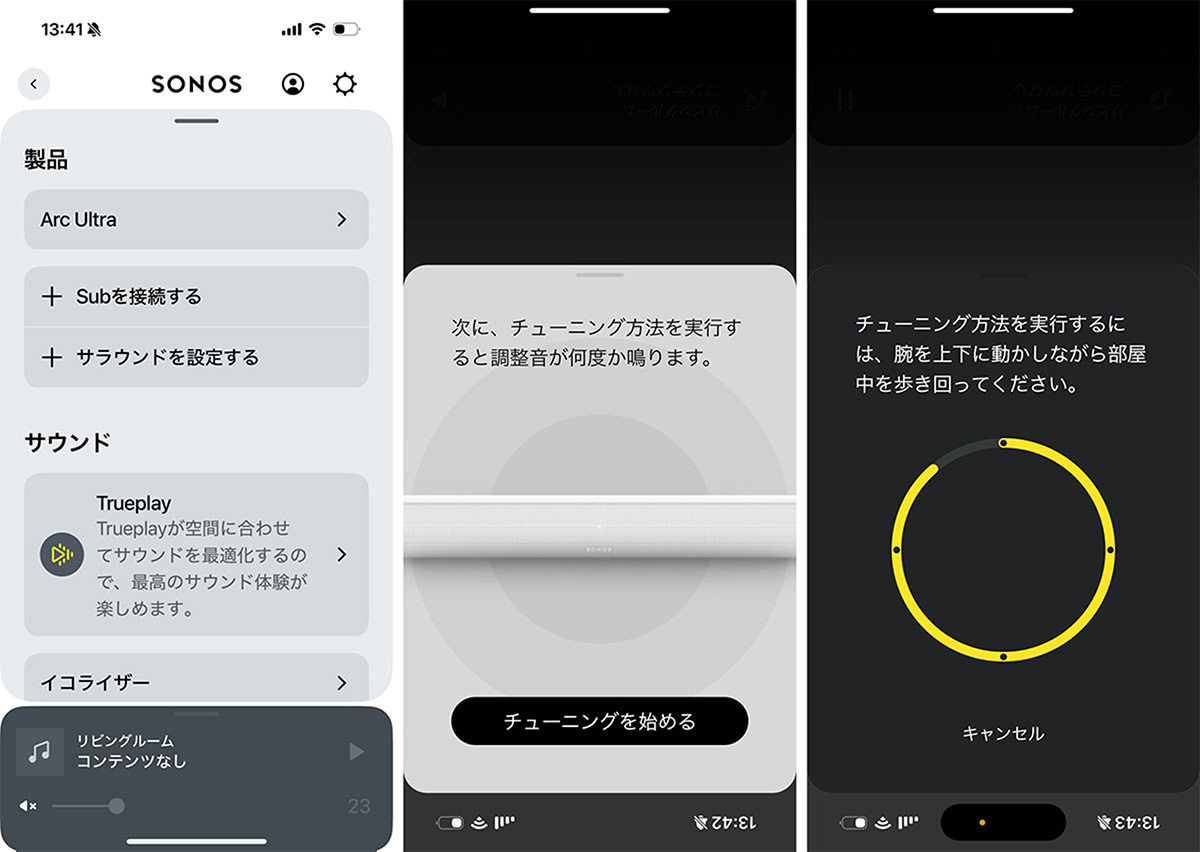 「TrueCinema」の測定は、Sonos Aceを装着した状態で普段テレビを見ている場所に座って行う。Sonosアプリの指示に従って操作するとサウンドバーからのテストトーンが再生され、測定時間は約5秒と非常に簡単だ。
