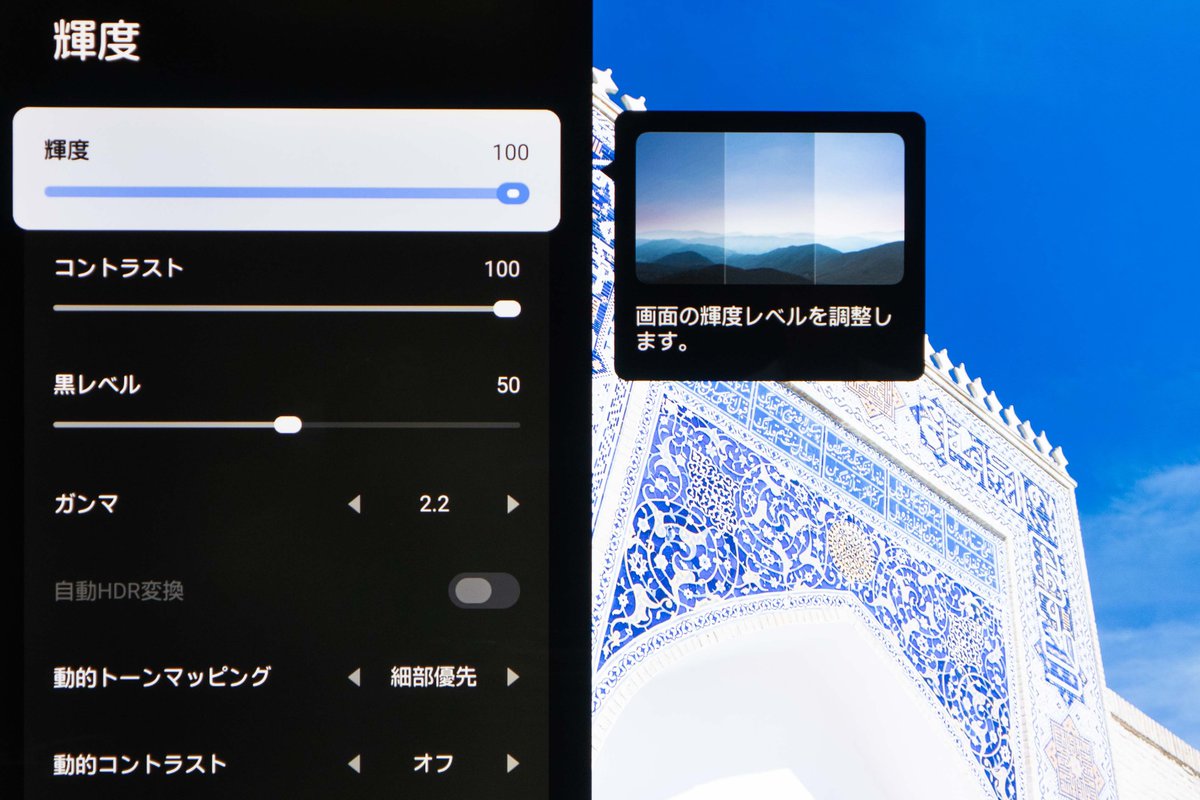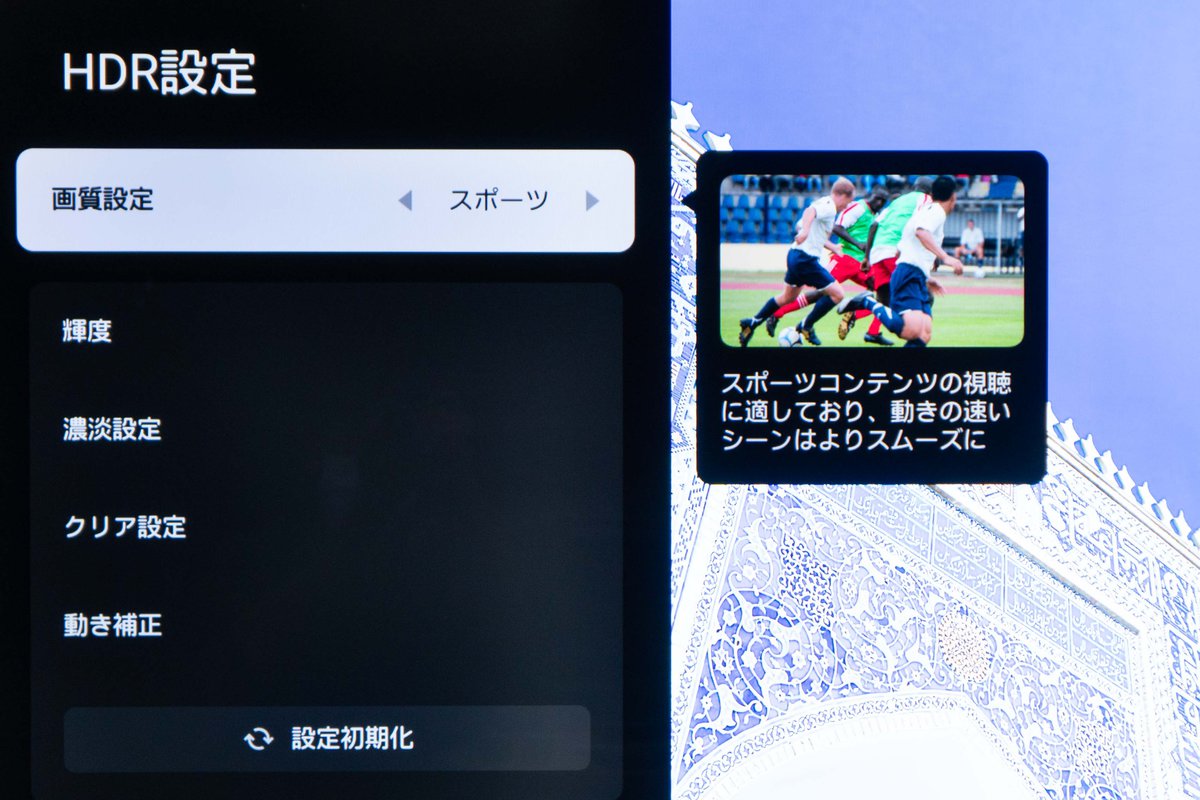 「AiPQ Pro プロセッサー」はナチュラル志向のアップスケーリングとともに、テロップの色彩を広色域の表現とビビッドな色彩で、映える画質を演出する。画面が明る過ぎと感じたなら輝度調整も可能なほか、「標準」モードを基本としてお好みの明るさに調整してみても良いだろう。