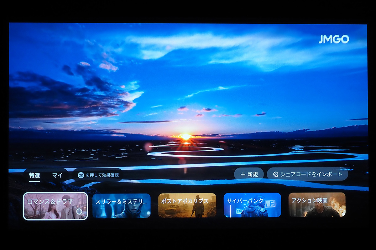 またJMGOは自社開発エンジンの利を活かし独自の機能を製品ごとに盛り込んでいるが、O2S Ultra 4Kにおいては映像モードの拡充が大きなメリット。従来の「ビビッド」「標準」「映画」「ダイナミック」に、新しく上述の「AI-強化」をはじめ「ソフト」「オフィス」「シネチューナーマスター」が加わり、全モードで詳細設定とカスタマイズが可能となった。