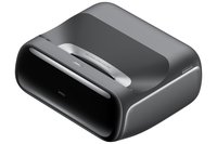 最初に目に飛び込んでくるのが衝撃的なまでの小ささ。横幅312mm、高さ140mm、奥行き290mm、質量4.5g。ブラックカラーもあいまって、壁際にあっても気づかないのではないか。サイズが小さいばかりでない。通常、超短焦点プロジェクターの投写比は0.17 - 0.25:1ほどが一般的だが、本機は0.16:1。壁との距離わずか15cmで100型の投写を実現する。