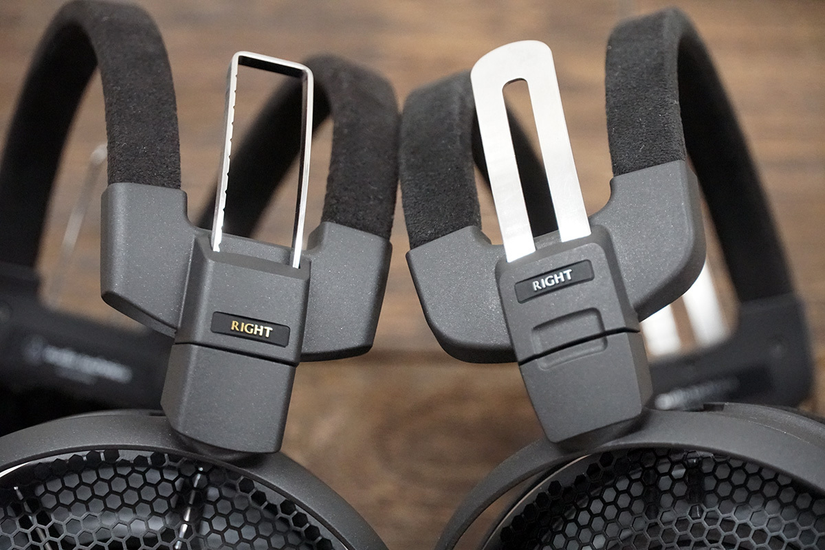 実機を並べてみると、似て非なることに気づく。両機とも一目でオーディオテクニカの定番オープンバックと分かるものだが、ヘッドバンドのスライダーはATH-ADX5000が金属板を打ち抜き加工したものなのに対し、ATH-ADX7000は肉厚のチタンをフレームのように立体的に加工している。長さ調整時のカチっとしたフィーリングや精度も併せ、剛性の違いが音の違いとしても現れそうだ。