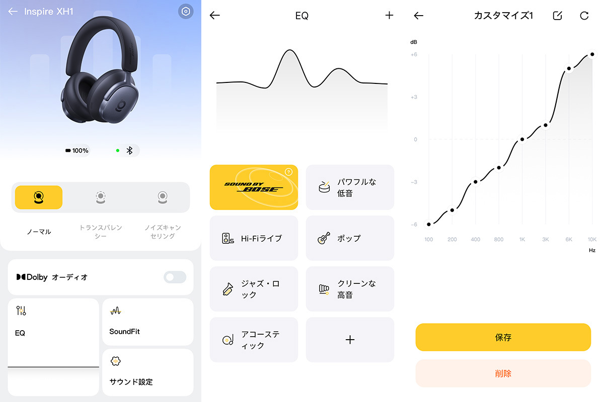 再生するコンテンツ、リスニング環境によっては低音の線をもっと太くして聴きたい場面があった。専用モバイルアプリのEQを立ち上げて、プリセットの「低音強化」「ジャズ・ロック」を選ぶと音の輪郭が鮮やかさを増す。ユーザーが任意に設定/保存できる8バンドカスタムEQも上手に併用して、好みのバランスに追い込める。