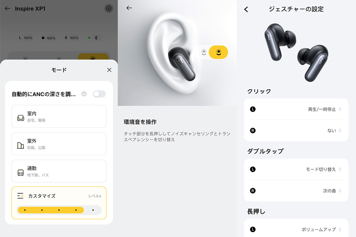 ベースアスのエンジニアがこだわったというXP1のフィット感は期待以上に心地よかった。長時間リスニングの疲労感とも無縁に過ごせる。アプリからアダプティブANCを設定すれば、自動で環境に合わせて最も心地よい消音バランスに整えてくれる。