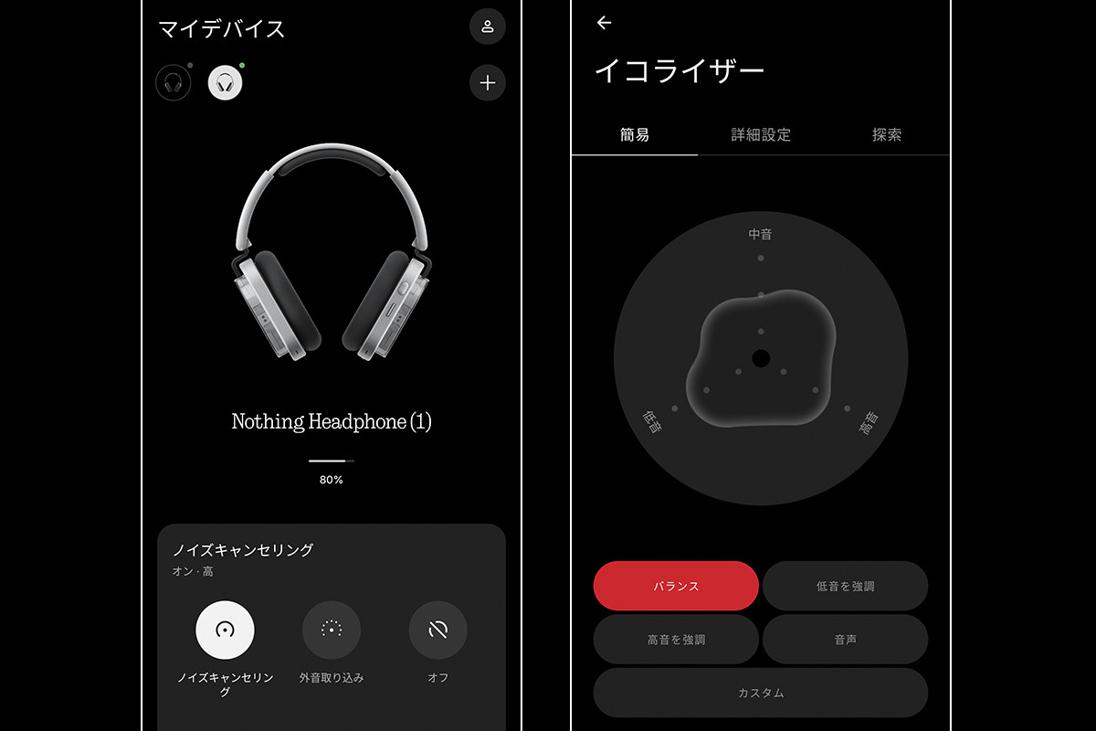 スマホアプリ「Nothing X」の操作画面。EQプリセットはバランス/低音強調/高音強調/音声強調/カスタムの5種類