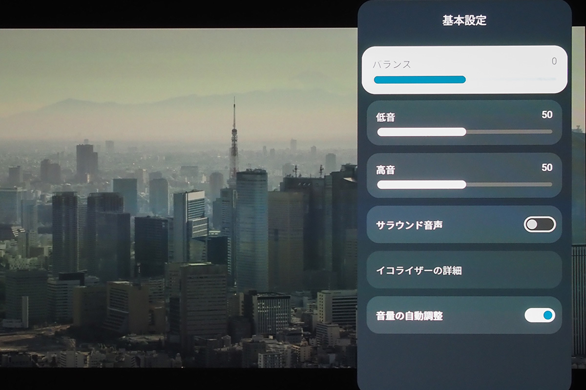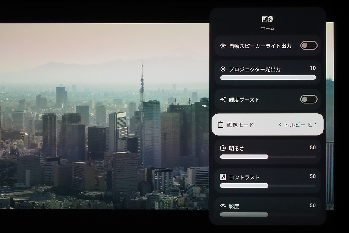 同じ画質設定のまま照明を付けても十分な画質で楽しめる点も、これまでにない視聴体験であった。5,700ルーメン(ISO)のポテンシャルを持ちながら、それを単に画面全体の明るさアップだけには用いず、画質チューニングも重視。とくに色の安定感、漆黒の沈み込みとハイライト表現のコントロールには、使いこなしに成熟を感じさせる。