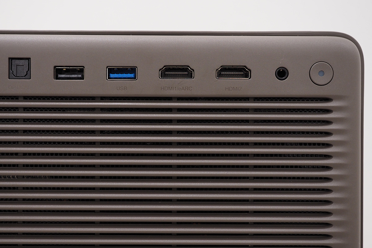 ●投写方式:DLP ●投写デバイス:0.47型DMD ●表示解像度:3,840×2,160 ●レンズ:光学ズーム・オートフォーカスレンズ ●光源:3色(RGB)レーザー ●投写サイズ:65 – 150型(推奨) ●明るさ:4,100ルーメン(ISO) ●騒音:28dB ●スピーカー:フルレンジ×2基 ●実用最大出力:12W+12W ●主な入出力端子:HDMI×2基(eARC/ARC×1基)、光デジタル音声出力×1基、ステレオミニ出力×1基、USB Type-A×2基 ●ワイヤレス:Wi-Fi 6(5GHz/2.4GHz)、Bluetooth Ver 5.2 ●消費電力:230W ●外形寸法:298W×249H×190Dmm ●質量:約4.9kg