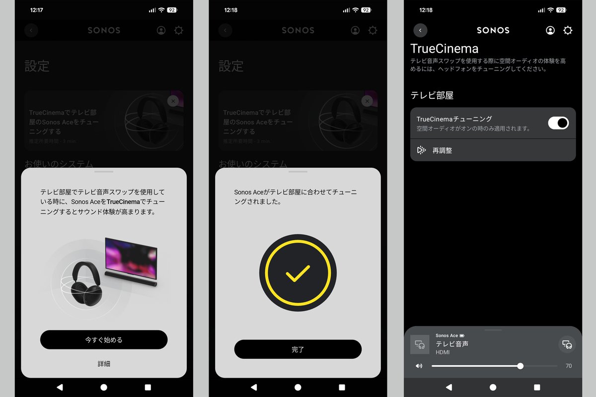 Sonos Aceとの連携で実現される「TrueCinema」も特筆ものだ。Sonos Arc Ultraの自動音場補正機能「Trueplay」による測定結果を利用し、Sonos Ace側でバイノーラルレンダリングするというこの機能、サウンドバーとヘッドホンという異種デバイスであるにもか関わらず、統一感のあるサウンドを楽しませてくれる。