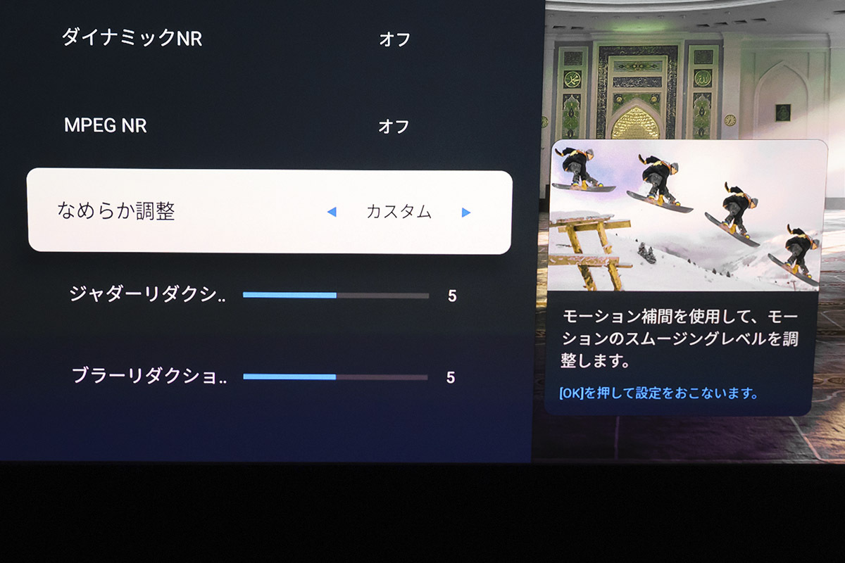 しかし、本機はカスタム調整でジャダーとブラーをそれぞれ10段階で調整可能。原画忠実という点ではオフが基本だが、筆者はジャダーリダクションをデフォルトから少しプラスに設定すると、2時間程度の視聴でも目が疲れず、かつ、映画の雰囲気も楽しめた。高輝度プロジェクターに嬉しい機能と言える。