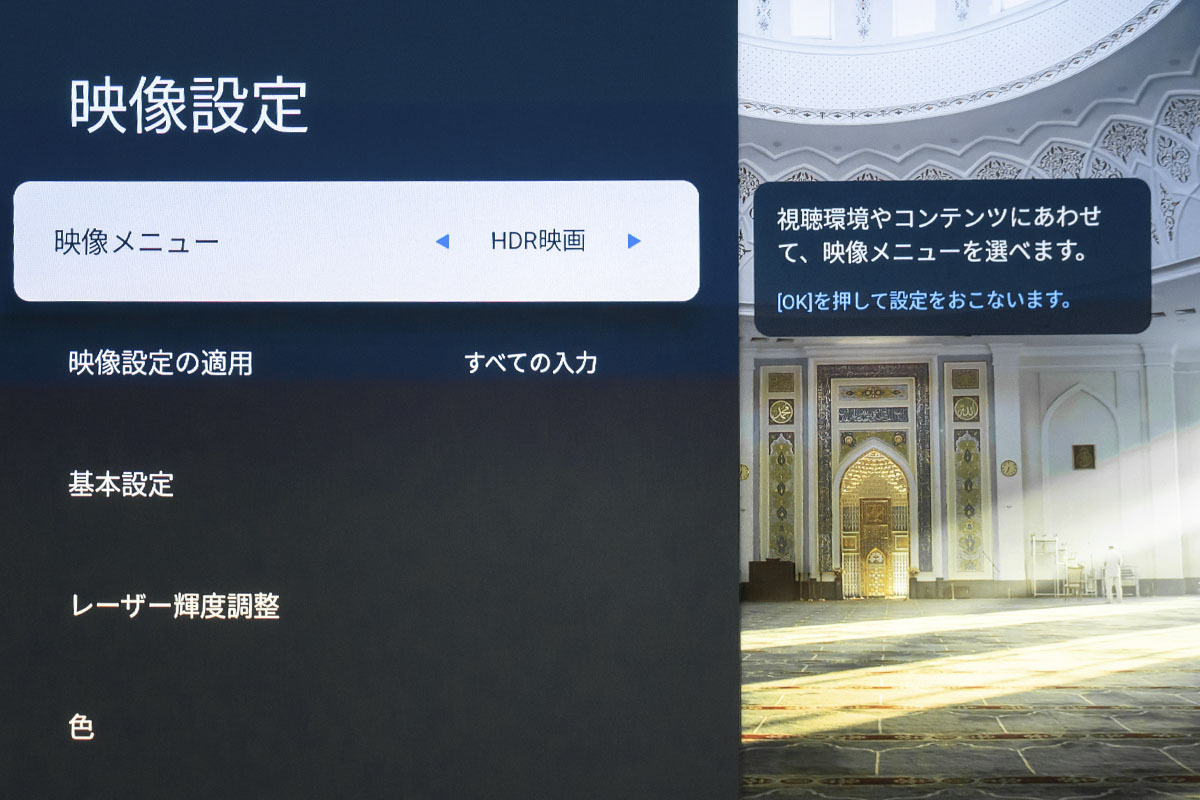 しかし、本機はカスタム調整でジャダーとブラーをそれぞれ10段階で調整可能。原画忠実という点ではオフが基本だが、筆者はジャダーリダクションをデフォルトから少しプラスに設定すると、2時間程度の視聴でも目が疲れず、かつ、映画の雰囲気も楽しめた。高輝度プロジェクターに嬉しい機能と言える。