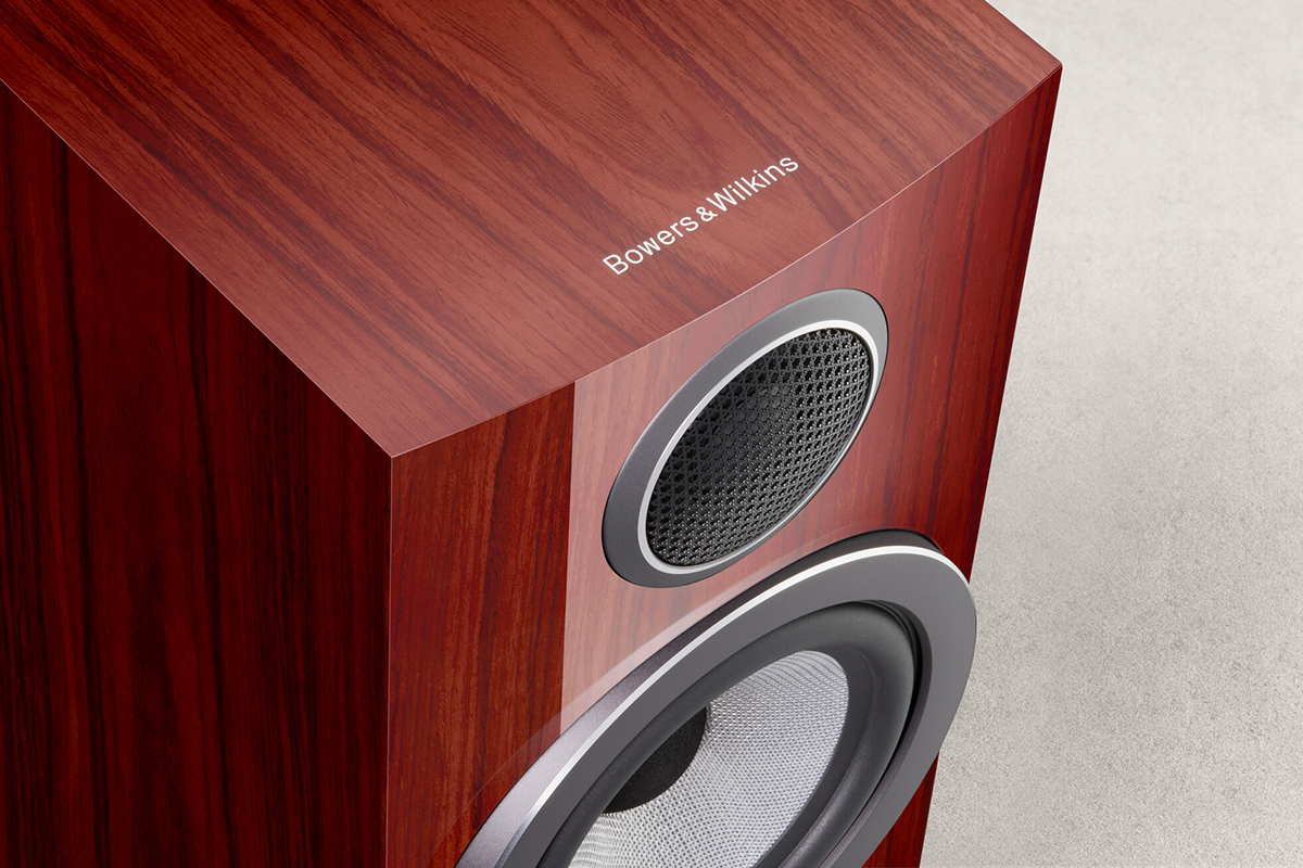 まず、デザインを見てみよう。キャビネットに12回に及ぶ染色とラッカー塗装を施した、光沢のあるサントス・グロス仕上げで登場した。深い味わいを感じさせ、実にエレガント。トゥイーターとミッド/ウーファーのシルバー・リング状のドライブユニット・ポッドが少し浮き上がり、デザインを引き立てるところがある。さすが、Bowers & Wilkinsの特別仕様としてのセンスの良さが反映されている。この仕上げは、透明感のある音、静けさを引き立てる音にも寄与している。