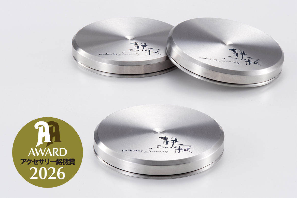 新潟の新進アクセサリーブランドSerenityの静寂(Shijima)シリーズより、秀逸な免振機構を採用したスイング式インシュレーターの薄型モデル「SWI-10」が、「オーディオアクセサリー銘機賞2026」を受賞した。