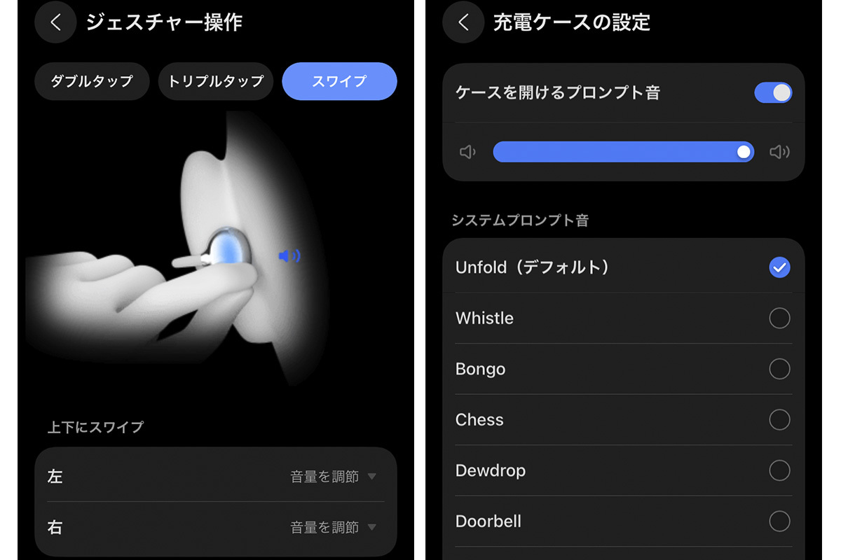 また、専用アプリ「Audio Connect」を使えば、落下防止機能を設定したり、ケースを開くときの通知音のカスタマイズなど、細かい設定が行える。