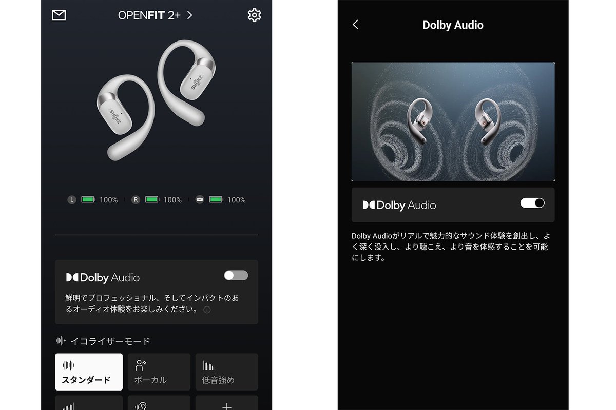 そしてOpenFit 2+では、Shokzアプリから「Dolby Audio」を有効にすることが可能だ。アプリから機能をオンにするとサウンドに空間的な広がりが付与される。映画鑑賞やゲームなど、没入感を優先したいコンテンツで活用したいところだが、意外にもステレオの音楽試聴やトーク系コンテンツでも有効だ。好みに応じて試してみてほしい。