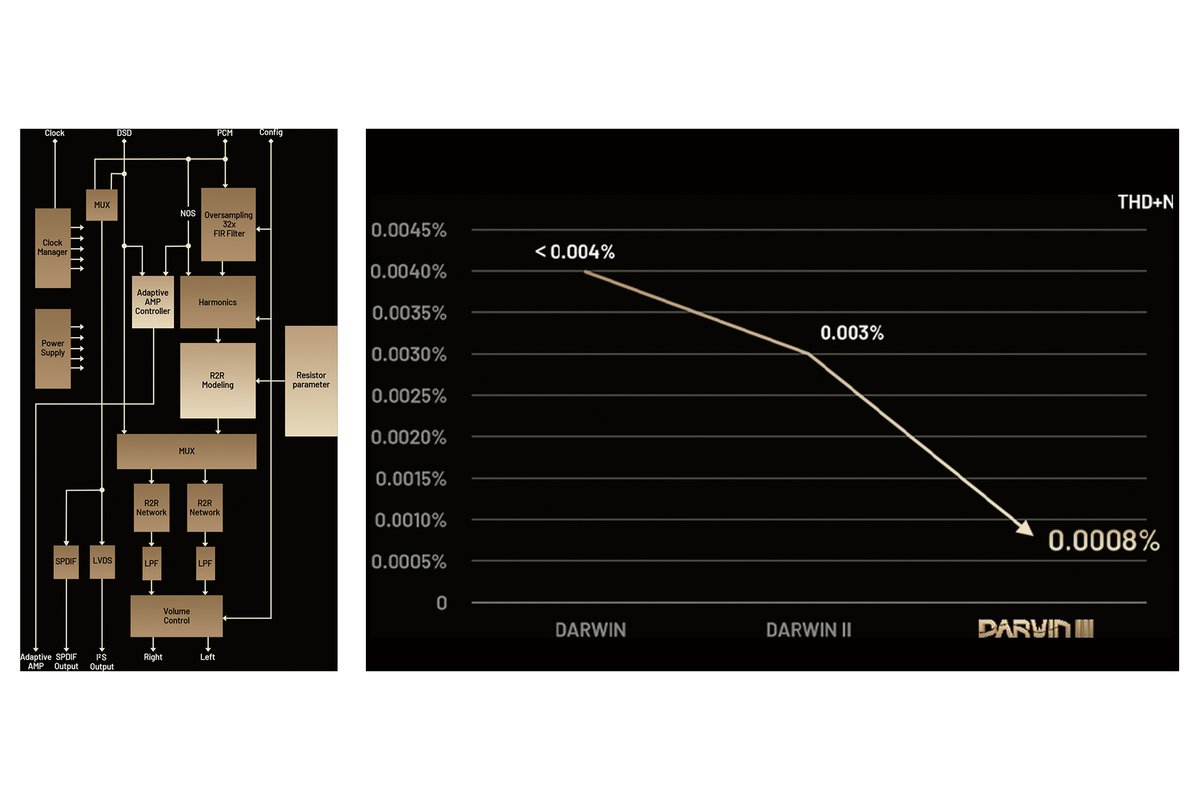 DARWIN IIIでは、LRの電源分離、多段階降圧回路の採用、抵抗ネットワーク設計と電子スイッチ間のマッチング精度の改善、R-2R回路の自社開発など大きく4つのブレイクスルーを達成。一般的にTHD+Nの数値を下げにくいR-2R DACで0.0008%以下という驚異的なS/Nを実現。これはDARWIN IIとの比較で約10分の1も低歪である