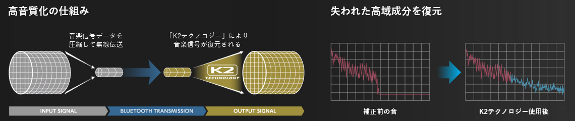 対して「K2」は、Bluetooth通信にはSBC/AACといった低ビットレートで安定性の高いコーデックを用い、音声データをイヤホン側で受け取ってから復元する仕組みなので、電波状況の影響を受けにくい。そしてiPhoneを筆頭としたSBCやAACにしか対応しないスマホでもオリジナルマスターと同等に復元できる。