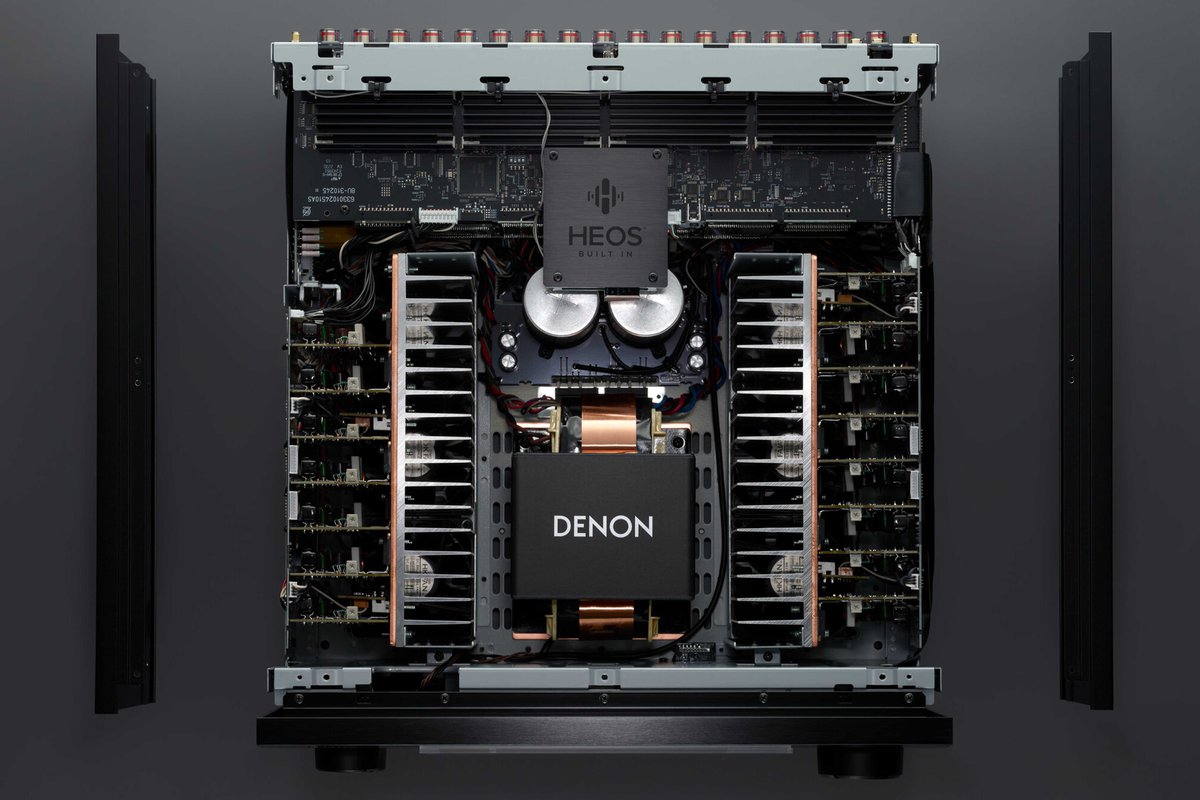 DACには、ESS社製のHi-Fiグレード2ch・32bit DACを10個使用しており、クロックにも超低位相雑音クリスタルを投入。内部振動を最小限にまで低減する構造「トリプル・レイヤー・コンストラクション」や、大電流タイプのパワートランジスタ「Denon High Current Transistor(DHCT)」など、Hi-Fiオーディオコンポーネントを彷彿させる高音質パーツが惜しみなく盛り込まれている。