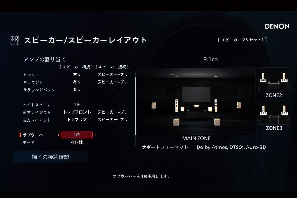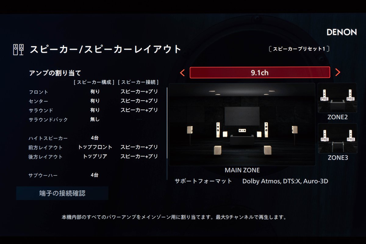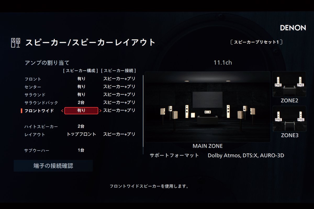 最後はハイグレードモデル群から、11chパワーアンプ内蔵の「AVC-X6800H」、そして13chパワーアンプを搭載する「AVC-A10H」。いずれもVGP2026で部門金賞を受賞。AVC-X6800Hは、定格出力140Wの11.4chシステムに対応で、最大13.4chプロセッシングをカバーしており、サラウンドバック/フロントワイドを追加できたりと、スピーカーアレンジの自由度の高さもプレミアムクラスの証だ。
