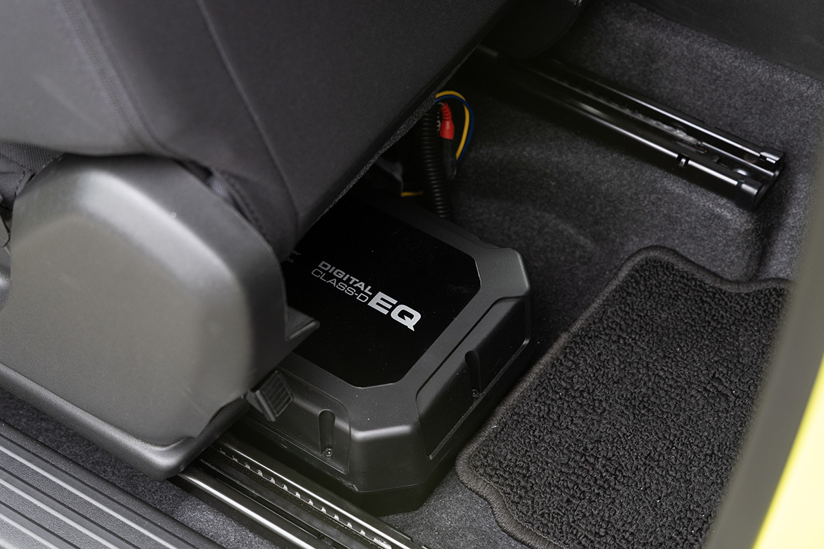 さらに低域を拡充するにはサブウーファーが望ましい。だがコンパクトなジムニー・シエラに設置スペースはあまりない。そこで24cm×14cm口径の薄型パワードサブウーファー「TS-WX400DA」なら、シート下に配置できる。