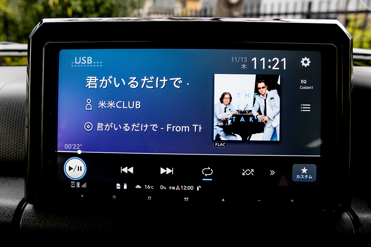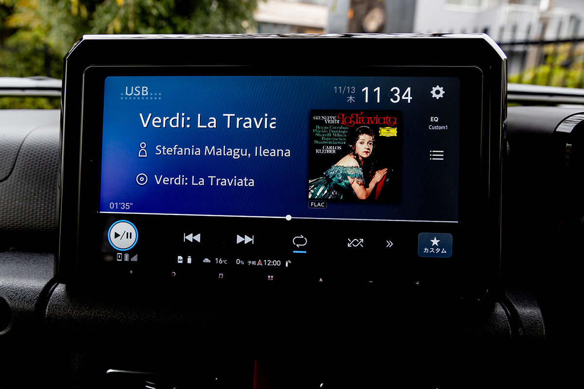 楽ナビ、という名のとおり、このナビはとても使いやすい。今回、USBメモリにハイレゾ音源を入れて試聴を行ったのだが、タグかフォルダ管理の両面をサポートしているので選曲もしやすく、またアートワークもキチンと出る。「アートワークなんて、普通に出るだろ」と思われるだろうが、国産の純正ナビの中には表示されないモデルがあったりするのだ。(注:楽ナビはハイレゾ音源はダウンサンプリング再生となる)