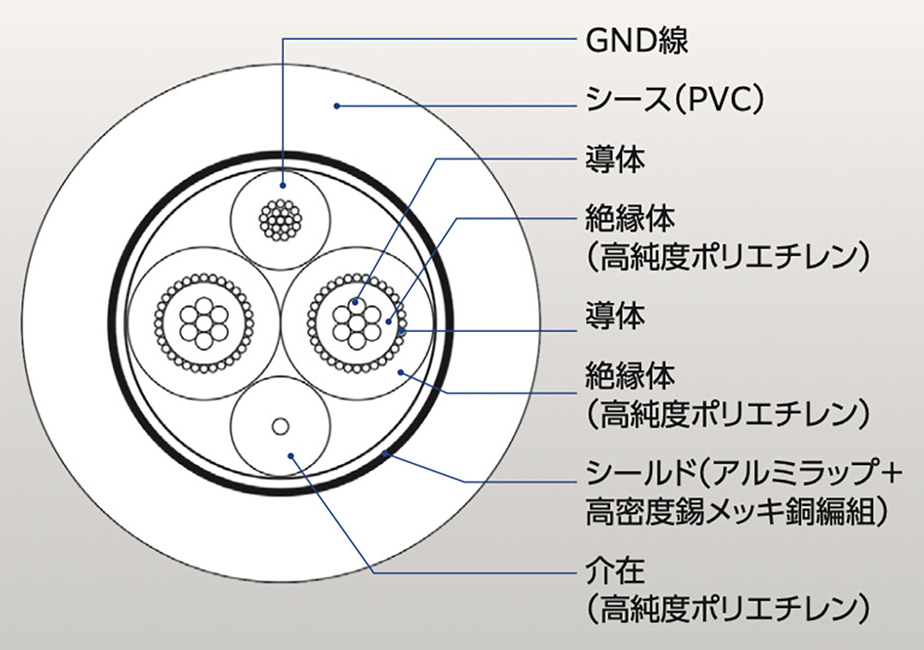 また、グラウンド線1芯を採用し、シールド線を機器側との片側接地にすることで安定した信号伝送を促しています。