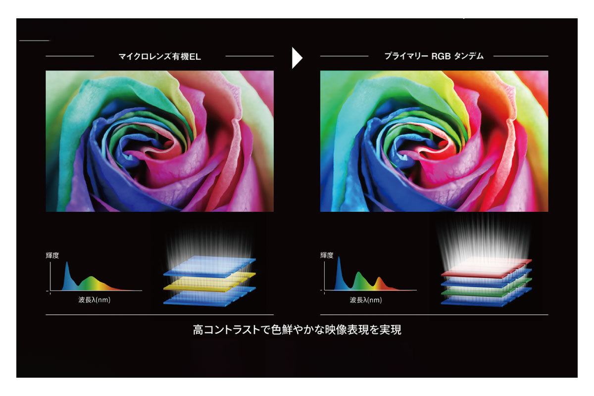有機ELの発光層を従来の「青+黄+青」3層から、「青+緑+青+赤」4層に改めることで、R(赤)、G(緑)、B(青)のよりピュアな発色を実現し広色域を達成。加えて発光効率の向上により輝度のアップも実現した。