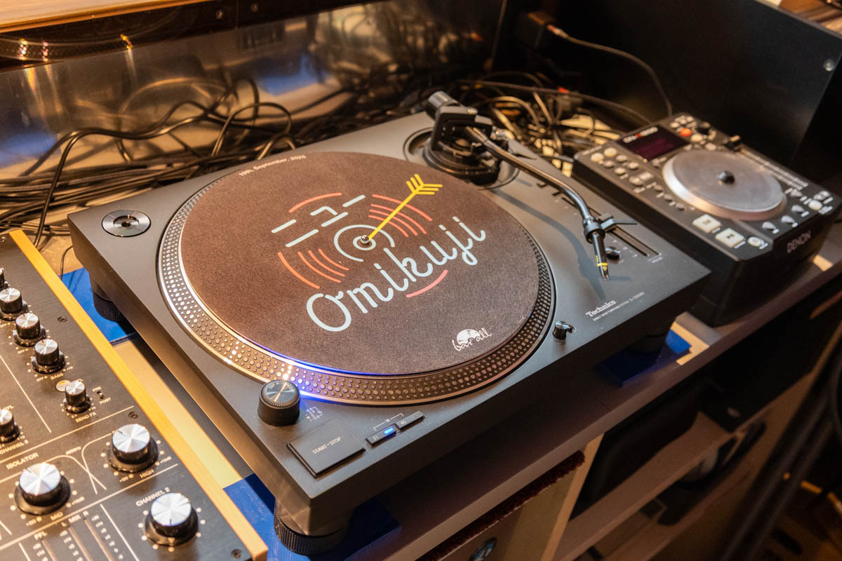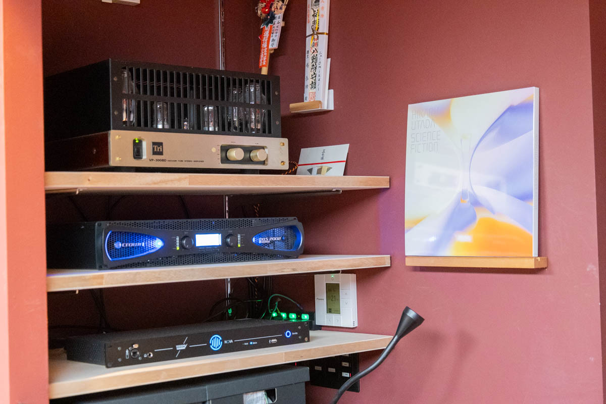 レコードバー「ニュー Omikuji」。アナログプレーヤーはテクニクス「SL-1200GR2」。そこからTRINNOVの「NOVA」で空間補正を施して、トライオードの真空管アンプ「VP300BD」で鳴らしている、こだわりの構成だ。