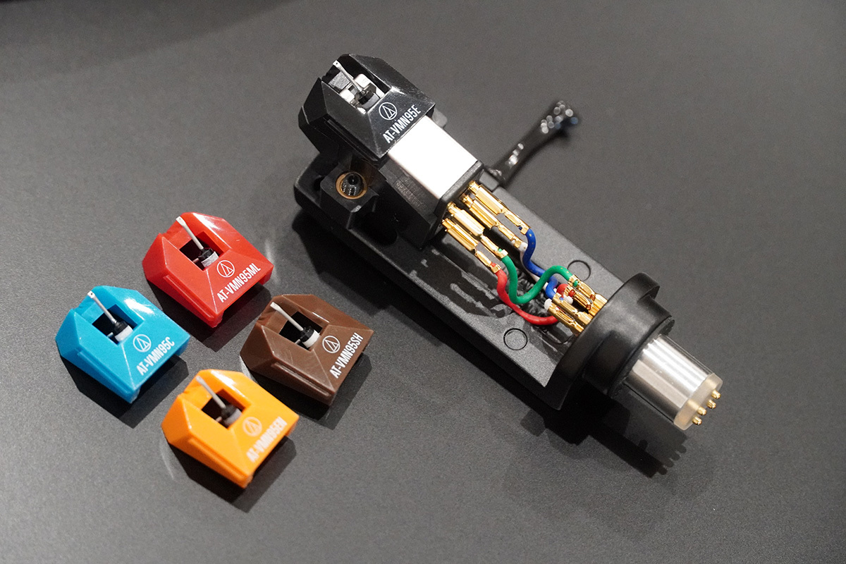 同社の新製品AT-LP7Xレコードプレーヤーをレファレンスとし、まずは付属カートリッジのAT-VM95E BKを装着して音を聴こう。ちなみに、これまで市販のAT-VM95Eは明るい緑の交換針ノブのみだったが、今回カラーバリエーションとしてノブが黒いBKバージョンも一般発売となった。
