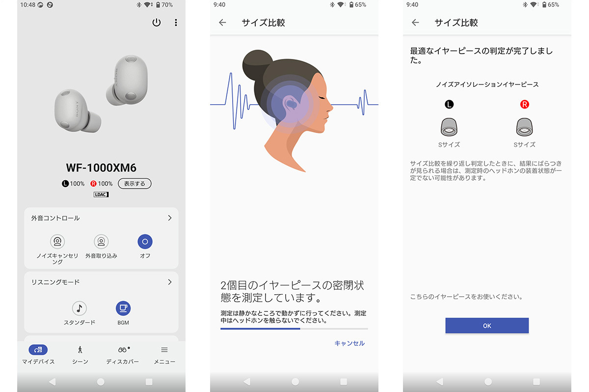 まず「SoundConnect」アプリの「デバイス設定」に並ぶメニューから「装着」を選び、「最適なイヤーピースを判定」する。耳に合ったイヤーピースを見つけることが先決だ。