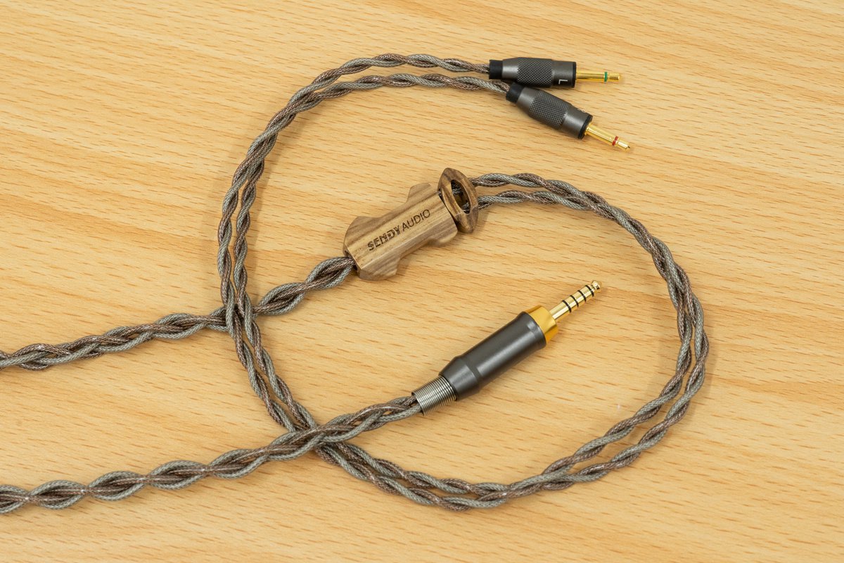 付属ケーブルは2重シールド設計でエナメル加工金メッキ銅と銀メッキ銅、古河電工製OFCを使用した3重複合材による4芯線を採用。コネクターは4.4mmバランス端子で、3.5mm変換ショートケーブルと6.35mm変換プラグが同梱。