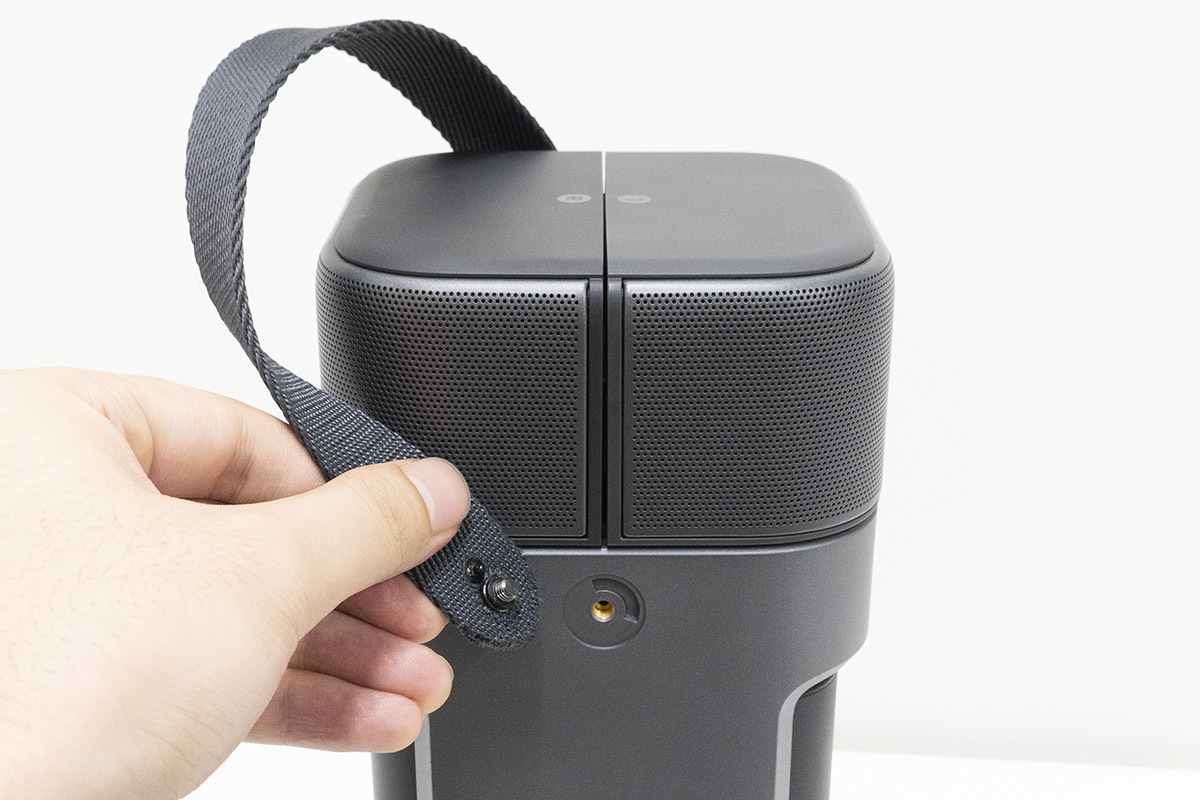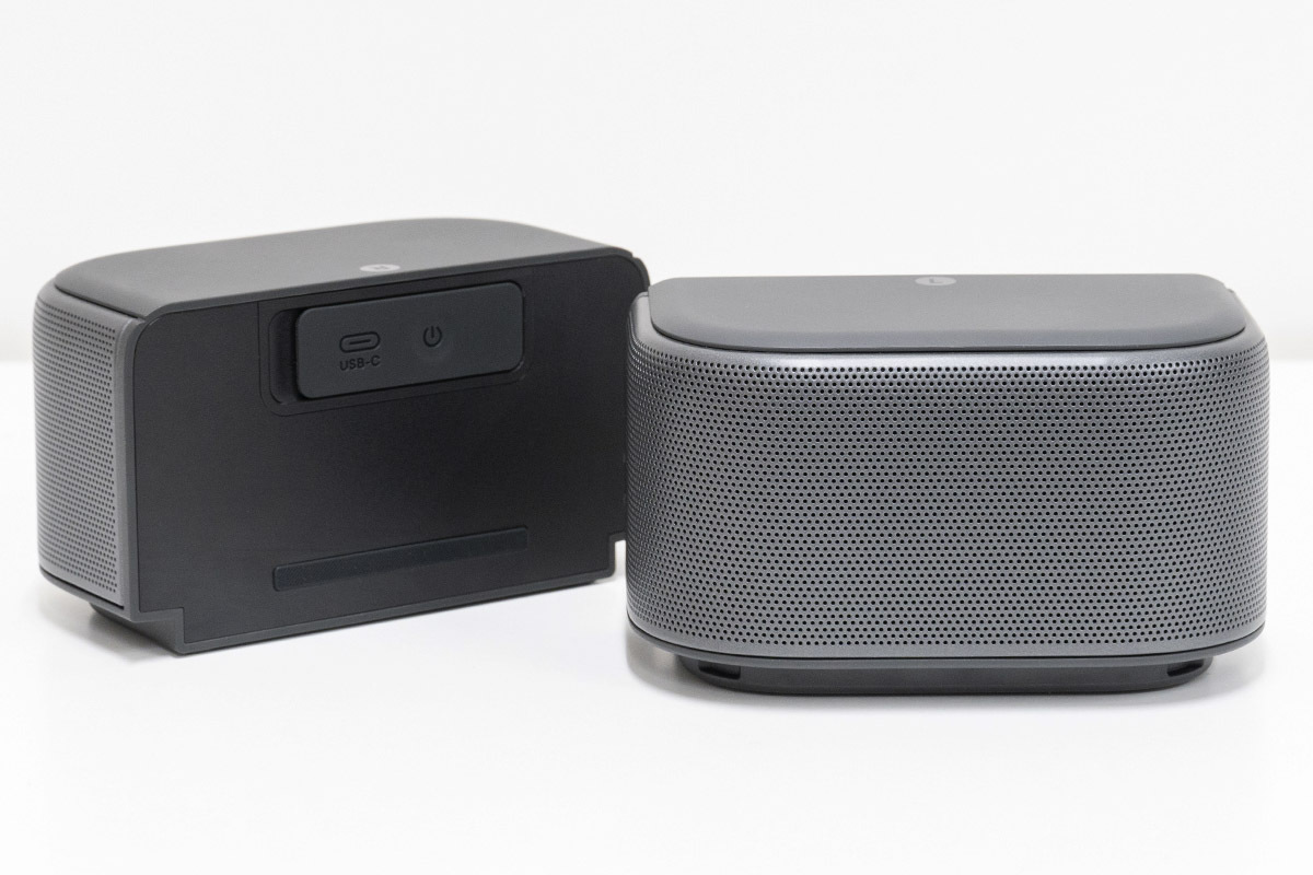 そして使い勝手の面で重要なポイントとして、この着脱式デュアルスピーカーは本体に合体させたままで使用できる点も見逃せない。ただしその際は、左右スピーカーが本体の前後を向く方向で合体している関係からか、音声はモノラル化され、デュアルスピーカーから同じ音が再生される形になってしまう。とはいえ普段使いとしては、さほどの不満は感じないだろう。