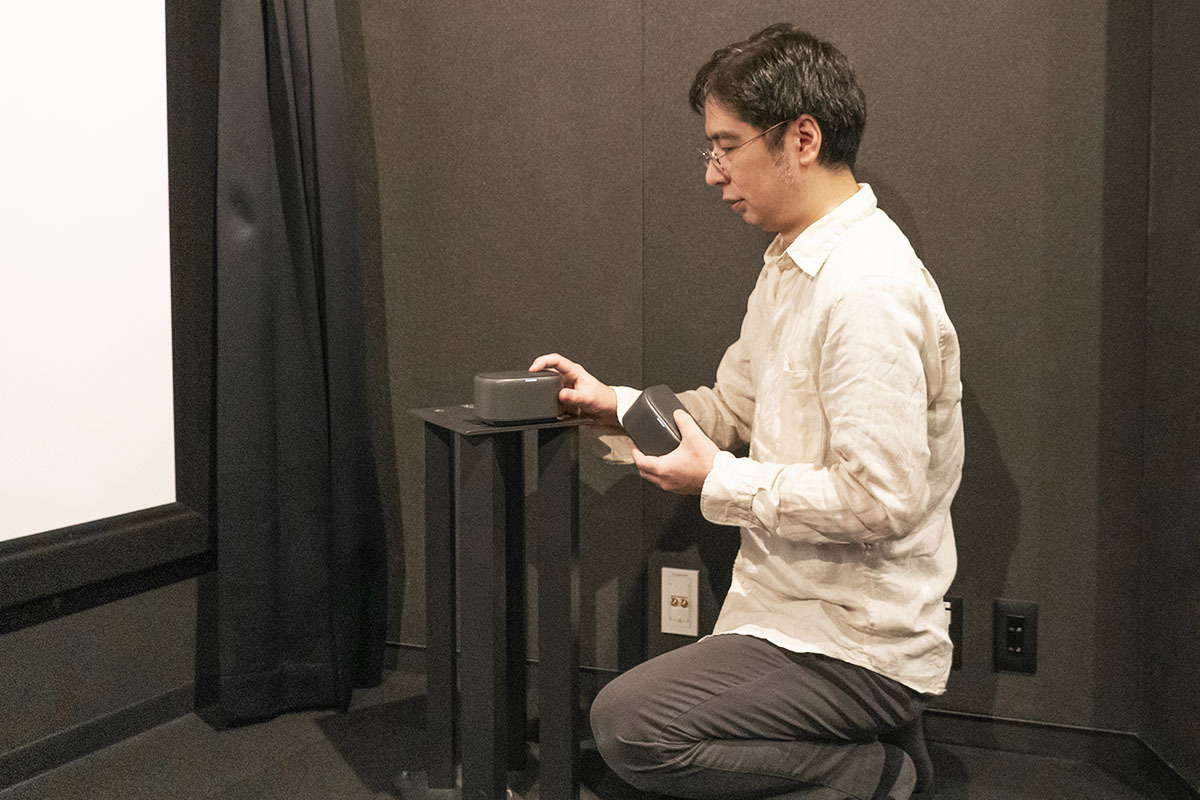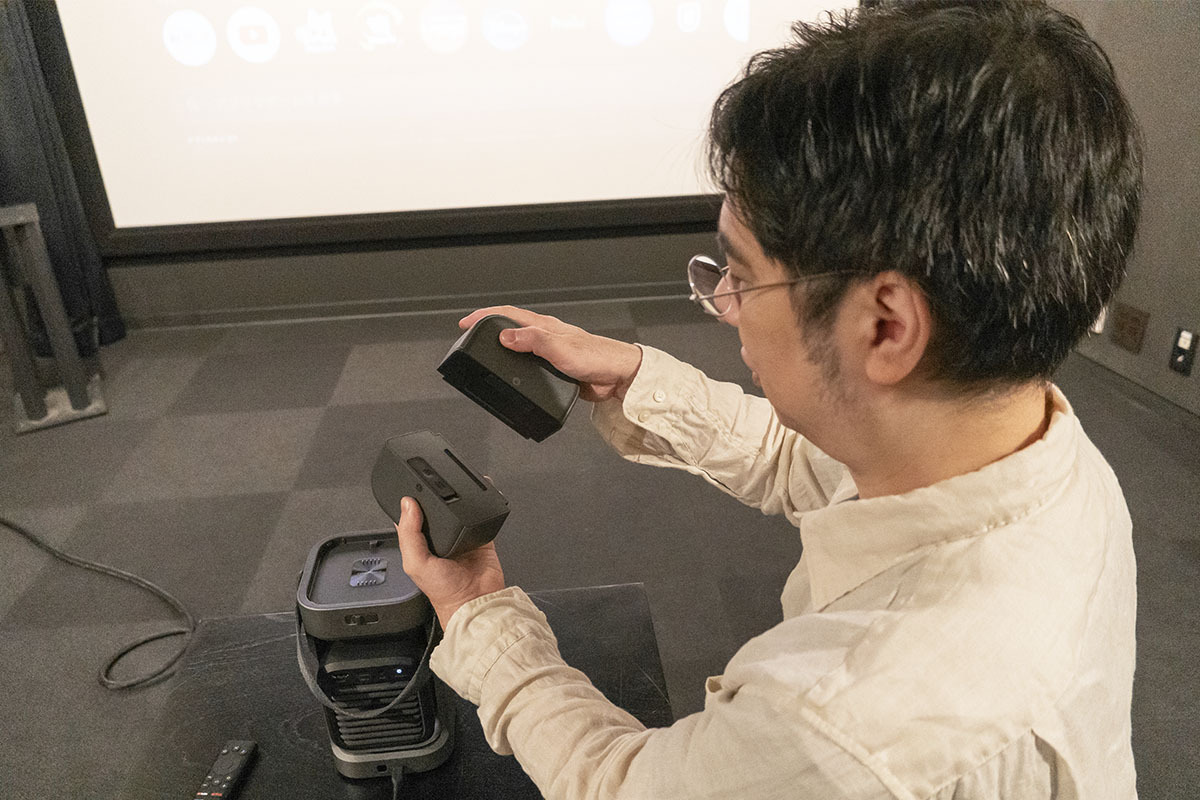 スピーカーシステムが生み出せる音響空間の広さは、結局のところ左右スピーカーの設置間隔、その幅の広さに依存する。そこで本機は本体上部にマグネット&クリックで合体収納しておける左右ワイヤレススピーカーという仕組みを採用。それを取り外して壁など投映面の左右幅に合わせて設置することで、プロジェクター内蔵スピーカーでは実現できない広さの音響空間を生み出すことに成功したわけだ。