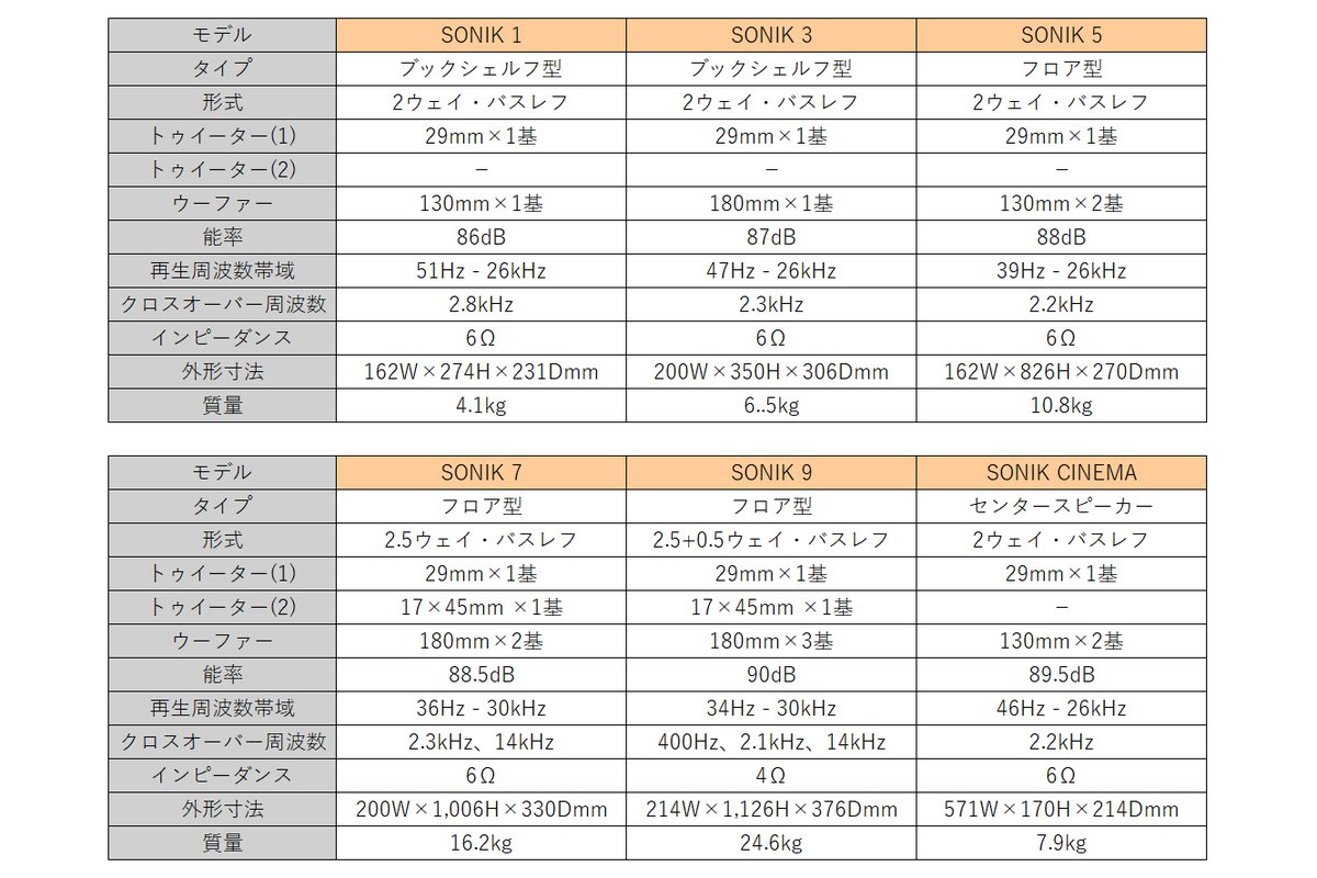 ラインアップとしては2ウェイ・ブックシェルフ型の「SONIK 1」「SONIK 3」、フロアスタンディング型「SONIK 5」「SONIK 7」「SONIK 9」そしてセンタースピーカーの「SONIK CINEMA」、オンウォール型の「SONIK ONWALL」の7モデル。