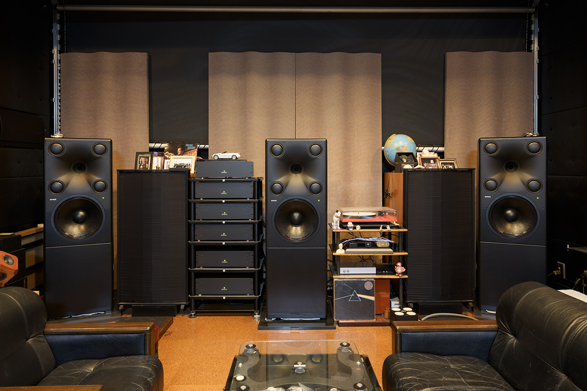 フロントL/C/Rのパワーアンプ合計6台を収めるため、以前は試聴位置後ろにあったJ1のオーディオラックを前方に移動、設置した。まるでこのためにあつらえたかのようにピッタリ納まっていて、絵面がきれい。ちなみにこれら6台の電源供給は200V。