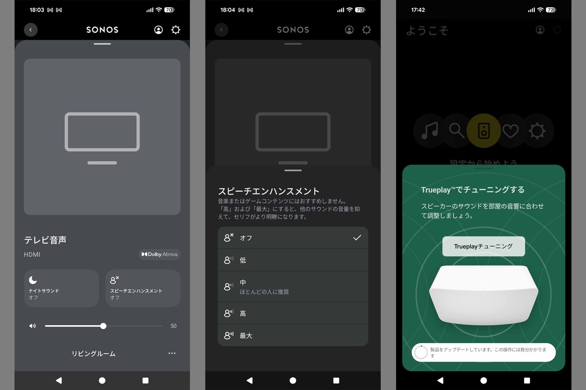 スマートスピーカーは、同一製品をもう1本プラスしてステレオ再生を楽しめるだけでなく、「Sonosアプリ」でサウンドバーとグルーピングして、「左サラウンド」「右サラウンド」に割付するだけで、リアスピーカーとしてシステムを拡張できる。サウンドバー単体でも立体音場の再生は可能だが、背面にリアスピーカーを設置して行うリアルなサラウンドには敵わない。