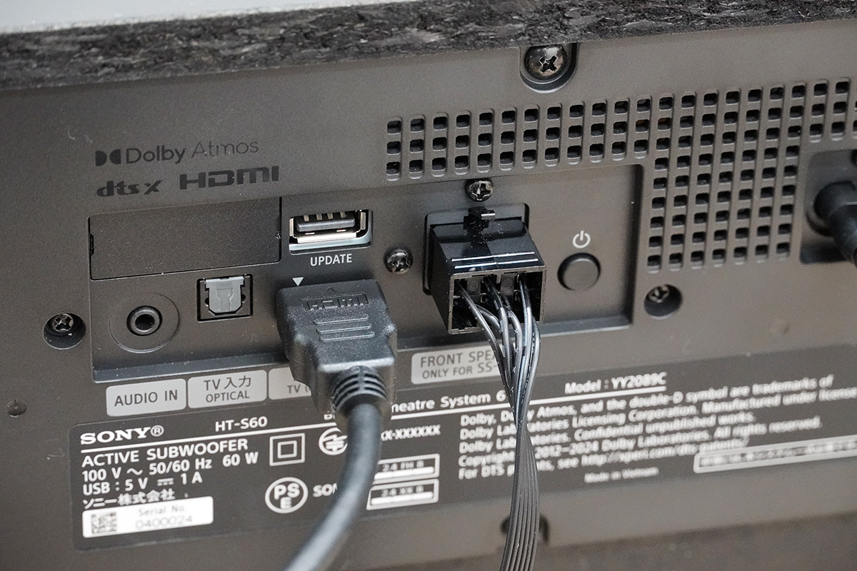 なお、実機をセッティングして最初にびっくりするのが、サウンドバーとサブウーファーの接続仕様だ。というのも本機、サウンドバー側ではなく、サブウーファーの方にHDMI eARC/ARC端子が搭載されていて、テレビとサブウーファーを接続して音声信号を伝送する仕組み。そのサブウーファーにサウンドバーを有線接続し、サブウーファー側から音声信号の伝送と電源供給を行う設置スタイルになっている。