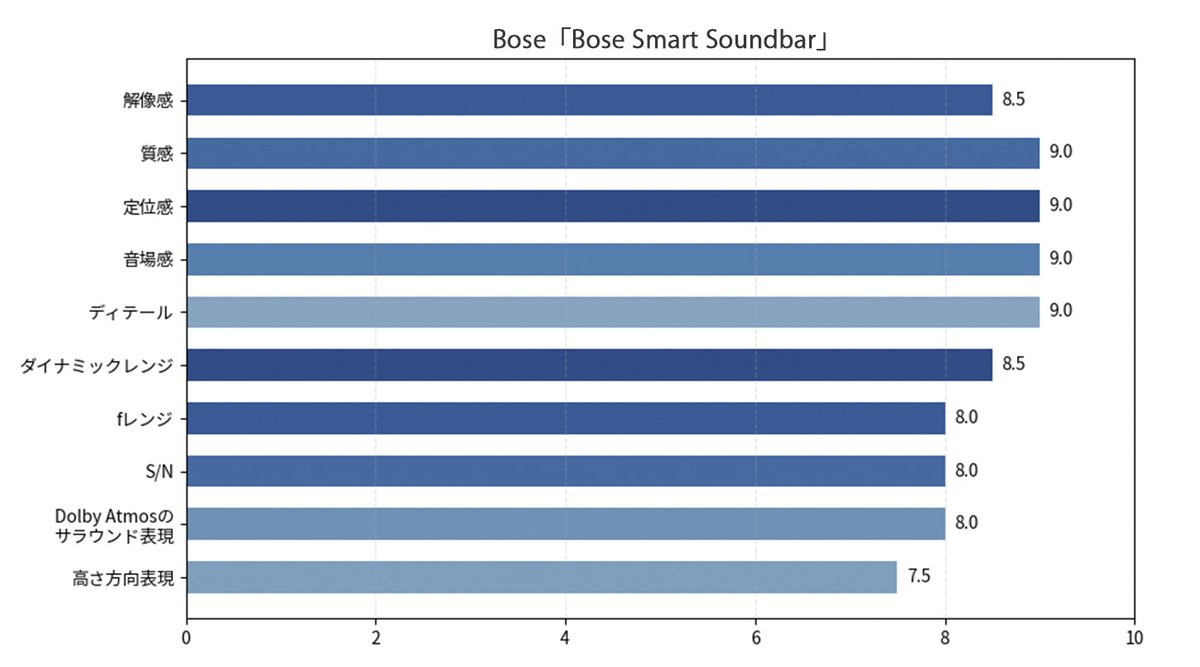 今回印象に残ったのは、まずJBLのコストパフォーマンスの高さだ。安価ながらセンタースピーカーを搭載することで、サウンドバーの音質評価の基本となるセリフの明瞭度が高く、アトモスの再現性も価格以上に感じた。
