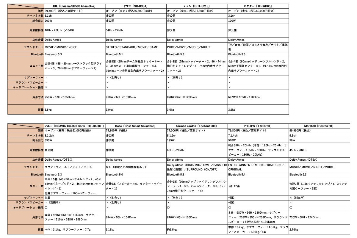 また、今回はDolby Atmos対応モデルに限定。Dolby Atmosの再現能力は、いかに限られた筐体の中で三次元音場を構築するかが課題となっており、物理的な対応チャンネル数以上に「音の出し方」で完成度が大きく左右される。そして、その再現力は、価格に比例していなかった点も興味深い。