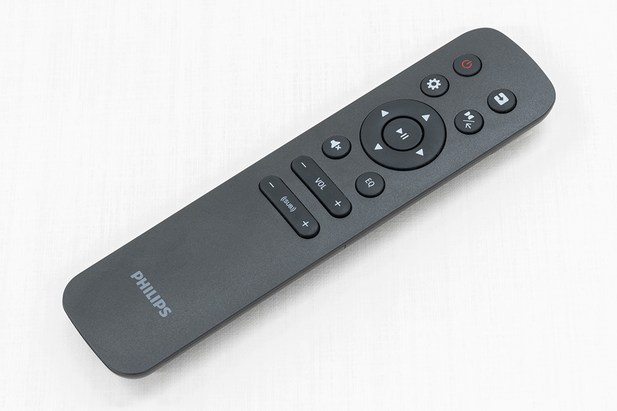 筐体デザインはスタンダード。LEDディスプレイによる文字表示機能も備える。スピーカー構成は55mm×75mm径の楕円形ユニットが4基、25mm径のトゥイーターが3基、さらに70mm径ユニットが2基。操作や設定は本体およびリモコンに加えアプリも利用可能だ。