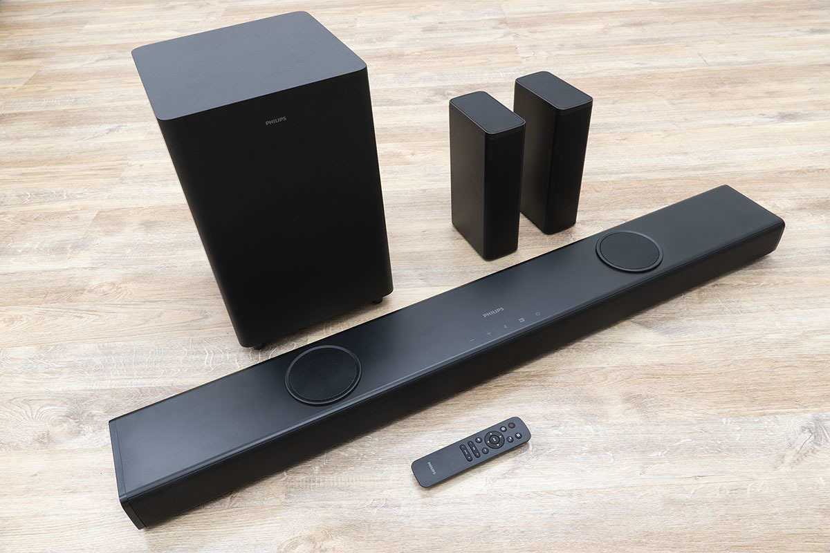 ヨーロッパを代表するメーカー初となるサウンドバーで、かなり力が入っている。特にスピーカー構成がすごい。本体に加えて、サブウーファーと、この価格帯では唯一、別体式のリアスピーカーが左右2個分付属する。