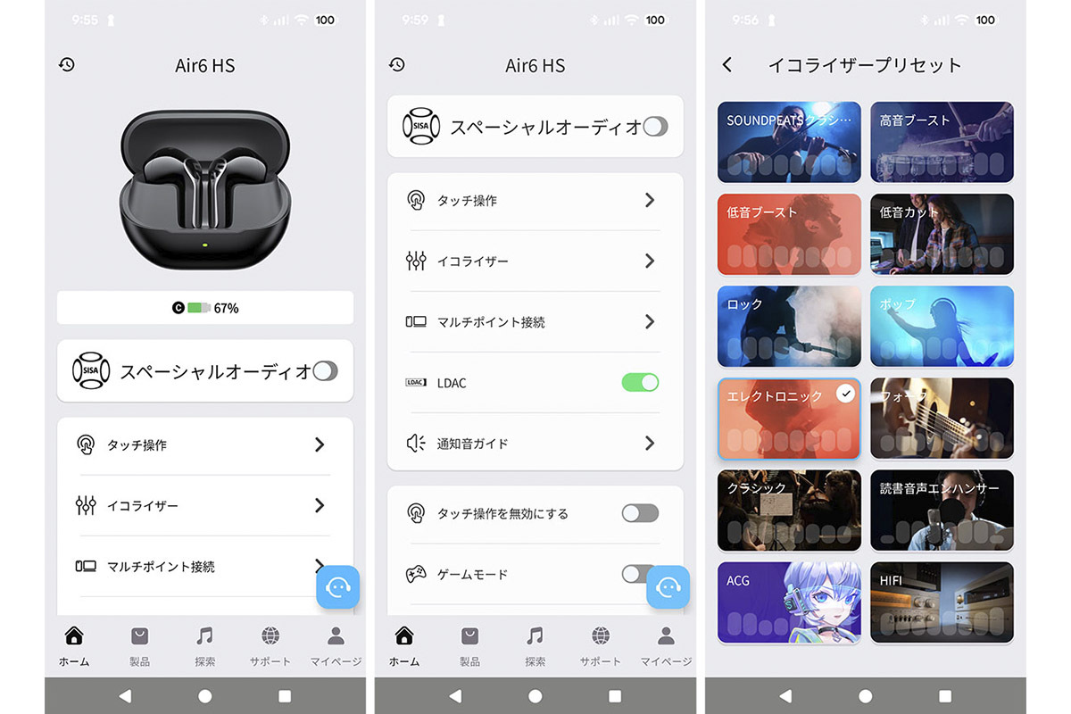 更に専用アプリ「SOUNDPEATS」にも対応。まず、LDACコーデックには最初に切り替えが必要となるため、利用の際にはチェックしておいてほしい。またスペーシャルオーディオ(空間オーディオ)機能、マルチポイント接続はAACコーデックでのみ利用可能だ。アプリ内では10バンドのカスタムEQが用意されており、サウンドのカスタマイズもできる。