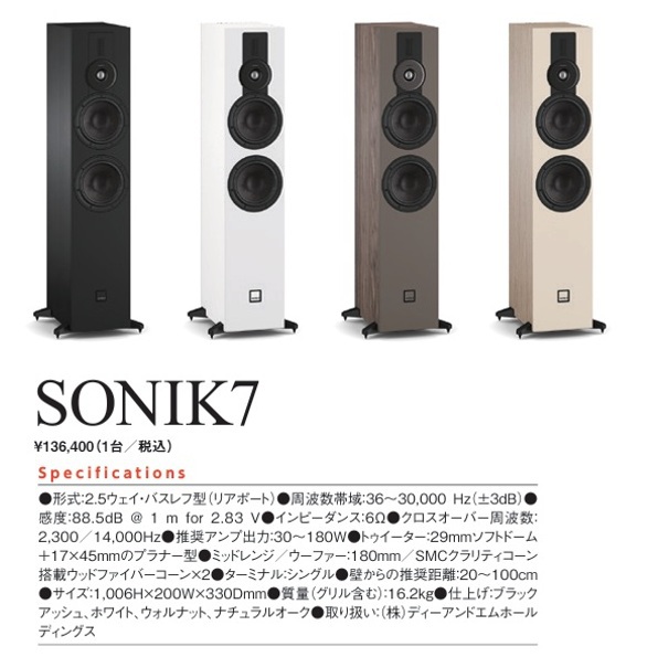 SONIK7は18cmダブルウーファー(パラレルドライブ)に独自のハイブリッド・トゥイーターを加え、2.5ウェイとした構成だ。高域と低域がぴったりのバランスを形成し、緻密な質感と抜けのいい響きを作り上げている。