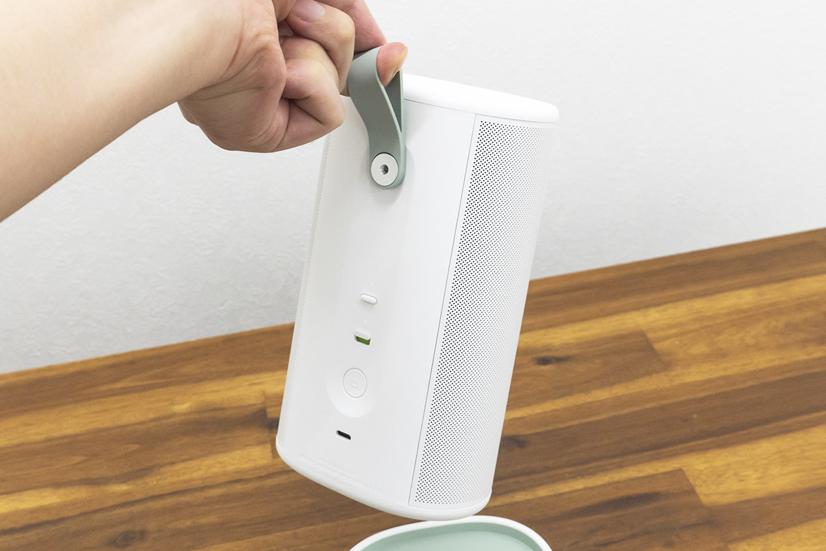 充電ベースを使える事もあり普段は決まった位置で置くルームスピーカーとしても扱いやすいし、ポータブルスピーカーとしてはやや大柄ではあるものの、着脱可能なストラップのおかげで、家中を移動する際にも持ち運びやすい。
