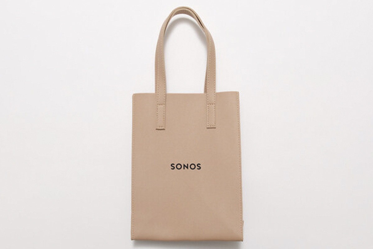 トートバッグは、Sonos Playを持ち運ぶのにちょうど良いA5サイズ。屋外での使用を想定して水や汚れに強いPVC合皮製を採用している。