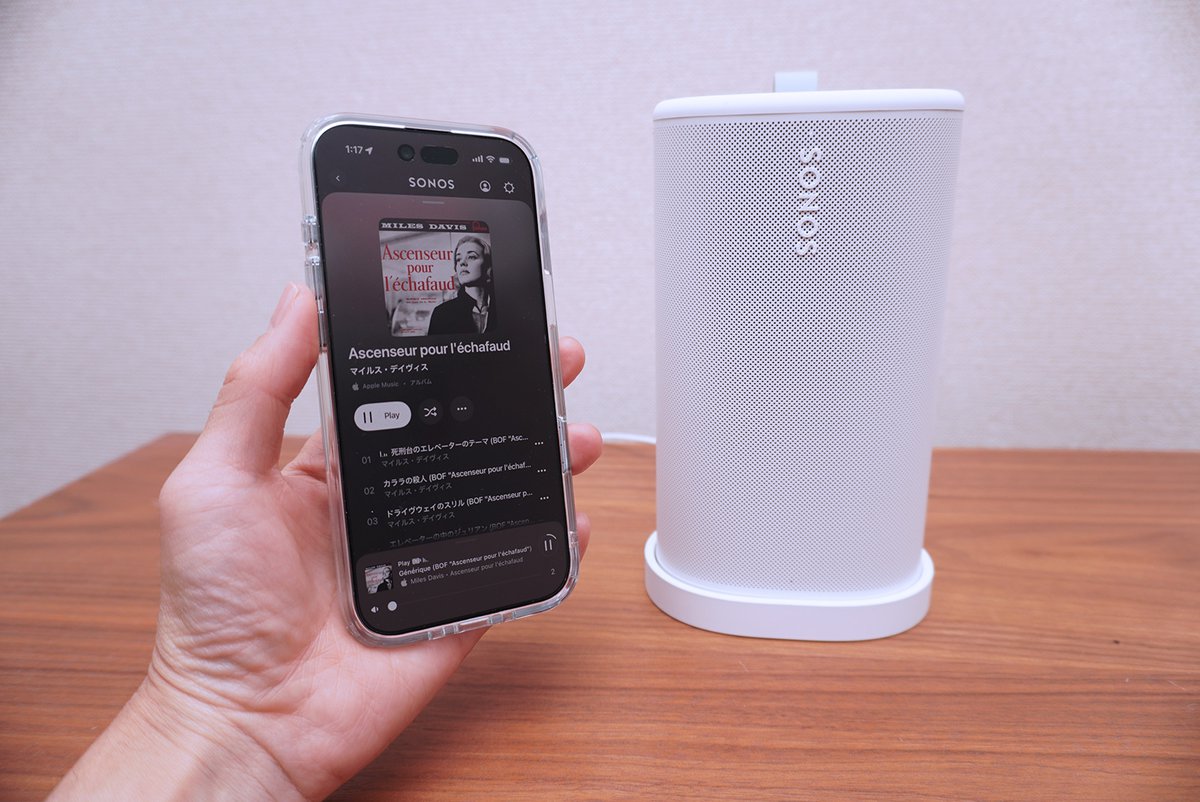 Sonos Playのサウンドを自宅で試聴した。Sonosアプリによる設定を済ませて、スピーカーをホームネットワークに参加させた後に、Apple Musicの楽曲をストリーミング再生した。