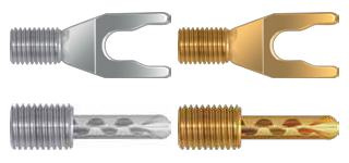 スピーカーケーブルはSpadeが標準装備だが、ネジ式でBananaにも交換できる。PlatinumからEclipseまではシルバー(Silver-Clad OFC)、Equinoxはゴールド(Gold/ Silver Plated OFC)仕様が標準装備