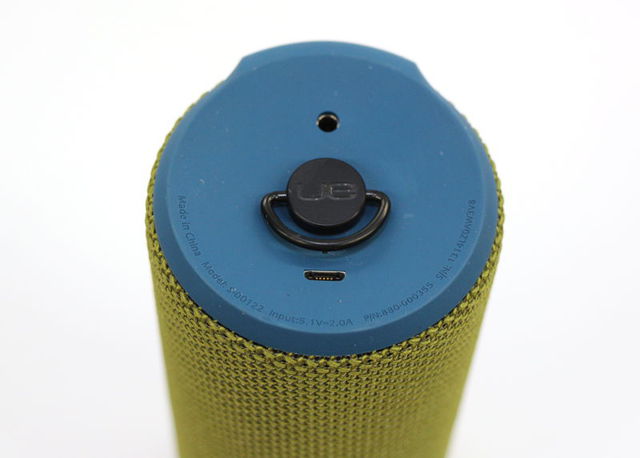 底面には金属製リングを備えカラビナなどに引っかけることも可能。充電やPCとの接続用のmicroUSB端子も装備する