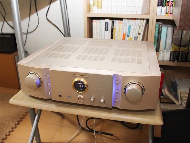 SA-14S1と純正組み合わせとなるプリメインアンプ「PM-14S1」(¥252,000/税込)。床置きはさすがに不憫なので、ニトリのミニテーブルの上に置いてしまいました