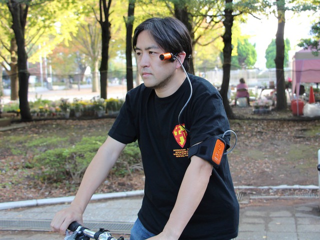「アームバンドケース」に本体を収め、カメラ部を専用フックで頭に装着して撮影