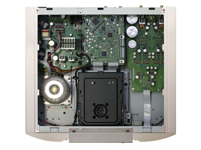 SA-14S1の内部構造。写真中央上段がデジタル入力部。右側には2段構成(前段がバランス構成のI/V変換回路、後段が電流帰還型アンプ)フルディスクリートアンプを配置