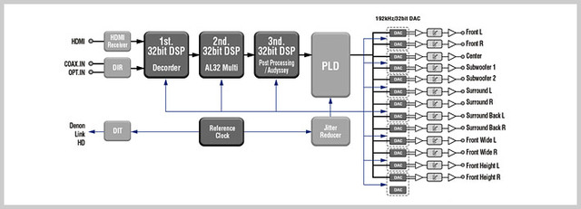 AVR-4520のデジタル部のブロック図。3基のDSD、7基のDACチップが搭載されていることがわかる